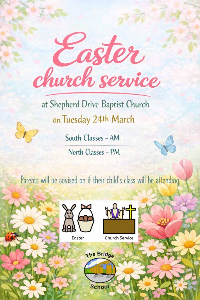 We would like to invite you to join your child, and other pupils for our Easter church service at Shepherd Drive Baptist Church on Tuesday 24th March at either 10am or 1.30pm. It will be a lovely opportunity to celebrate this season together!