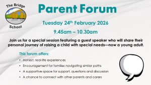 Our next Parent Forum is on Tuesday 24th February 26. Parents and Carers are invited! Join us for a special session featuring a guest speaker who will share their personal journey of raising a child with special needs – now a young adult.