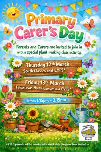 Parents and Carers of our North classes, Felixstowe classes and part of EYFS are invited to our Primary Carer’s day to join in with a special plant making class activity.