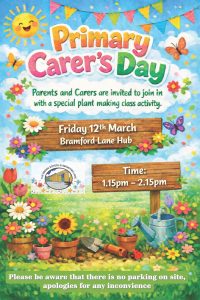 Parents and Carers of our Bramford Lane Hub are invited to our Primary Carer’s day to join in with a special plant making class activity.